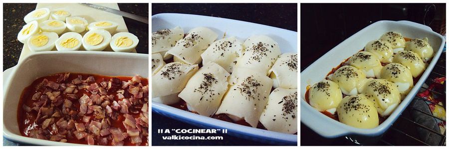 - Busca un recipiente apto para horno y agrega los ingredientes en el siguiente orden: la slasa de tomate, el bacon, y las mitades de huevo hacia abajo. Cúbrelos con porciones del queso y un poco de orégano.