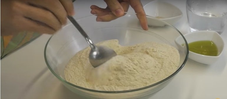 - Ahora, vierte el agua y el aceite y vuelve a mezclar, para que la harina absorba bien ambos ingredientes.