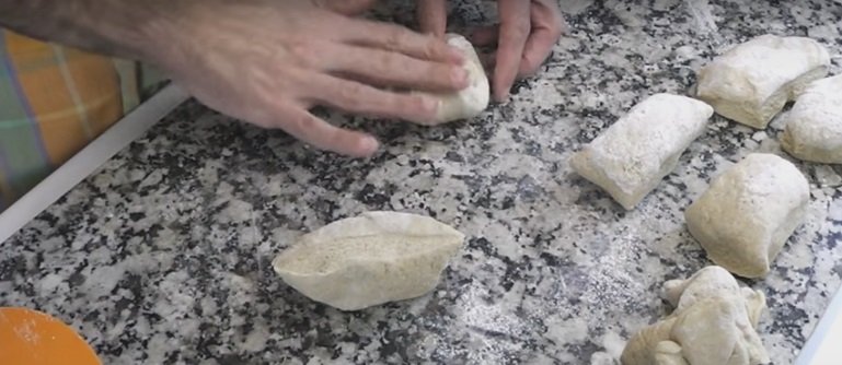 - Cuando esté lista, vierte la masa sobre la superficie de trabajo, ligeramente enharinada, y divídela en 8 porciones iguales. Puedes auxiliarte de una balanza de cocina.