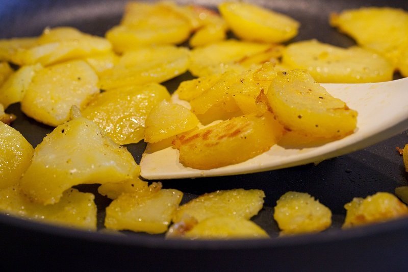 Por lo tanto, es mejor freirla en una sartén aparte y mezclarla con las papas al final de la cocción (4-5 minutos antes de cocinar). Para mejorar el sabor, 1-2 minutos antes de que el plato esté listo, puedes poner un trozo de mantequilla sin sal en la sartén.