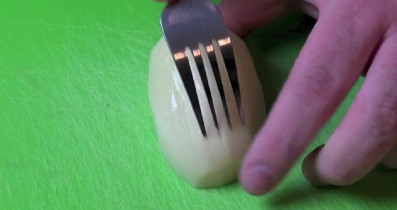 - Rasga todas las superficies de las papas. Los vegetales producirán el zumo que se horneará, convirtiéndose en una cáscara crujiente.