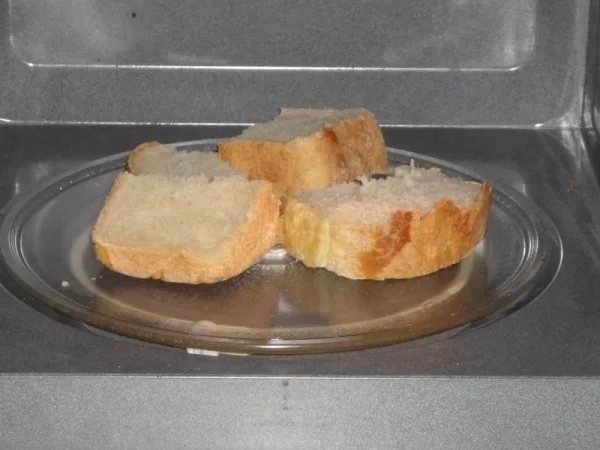 - Corta el pan en rodajas y ponlo en el microondas durante 10-60 segundos, fijándolo a potencia mínima.