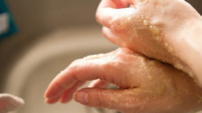Peeling: Necesitarás 2 cucharadas de sal marina, una gota de resina de árbol del té y 2 cucharadas de aceite de coco (se puede reemplazar con aceite vegetal). Mezcla todos los ingredientes. Pon la masa en las manos y comenzamos a masajear, pasando de la muñeca a la punta de los dedos.