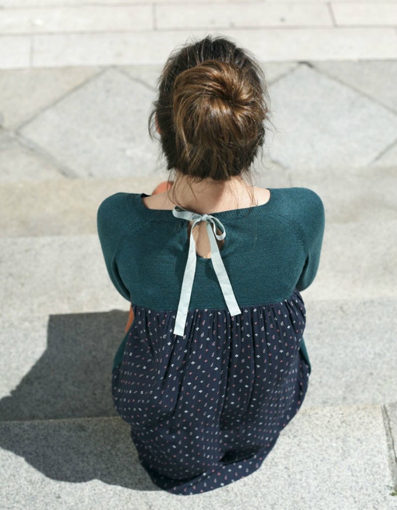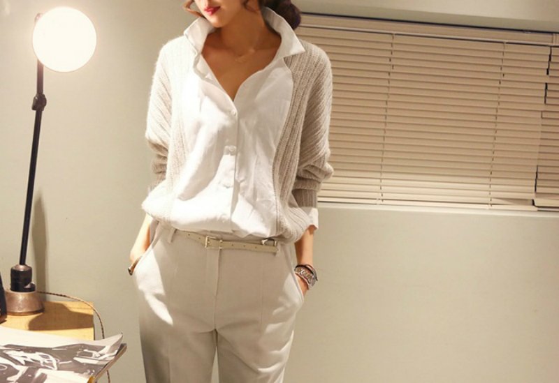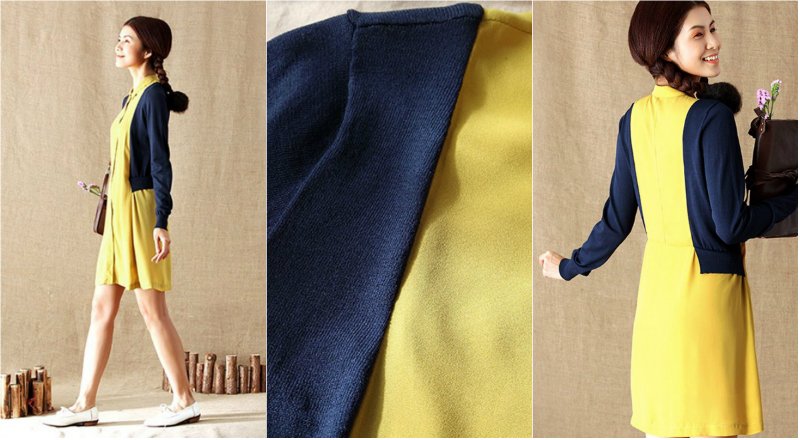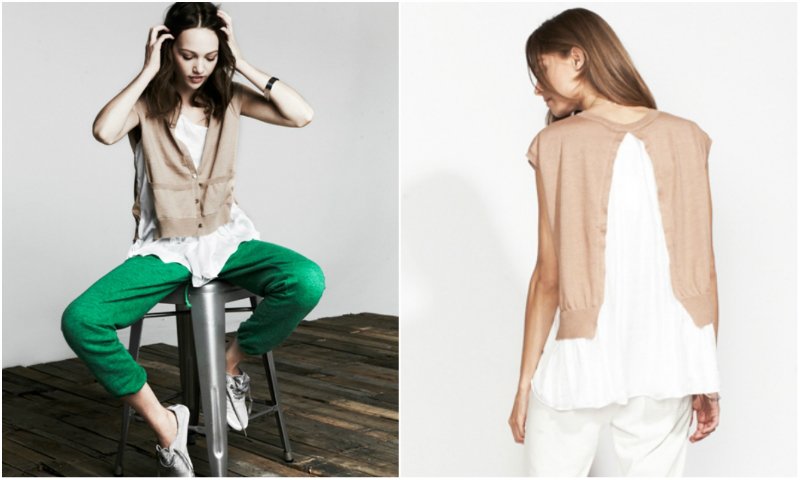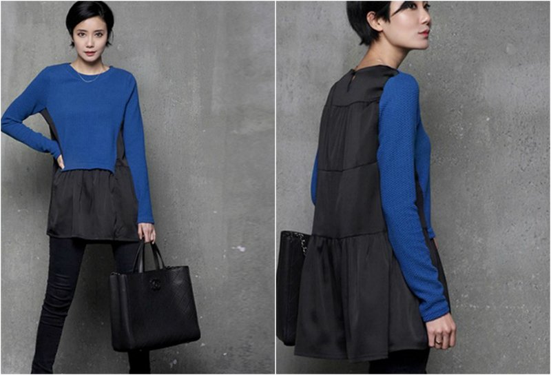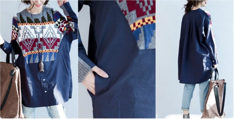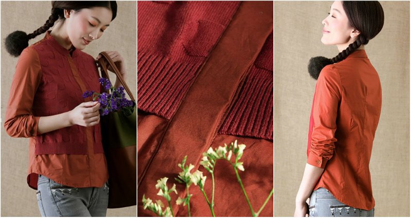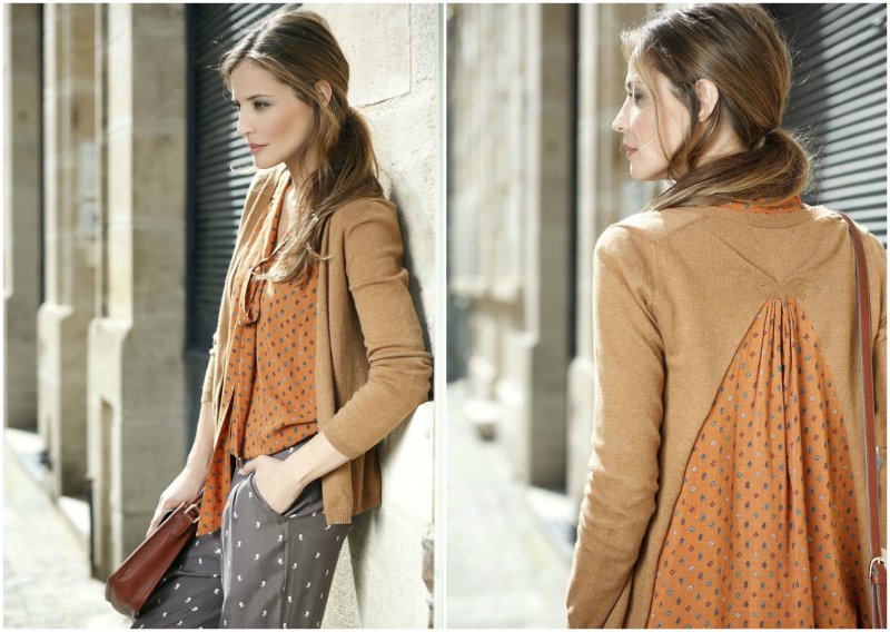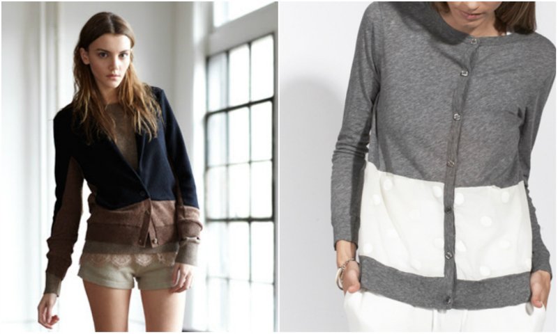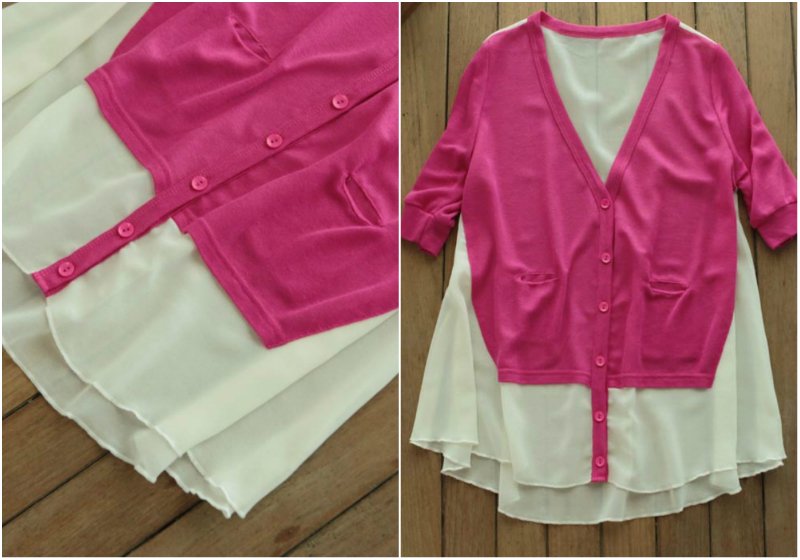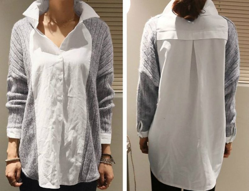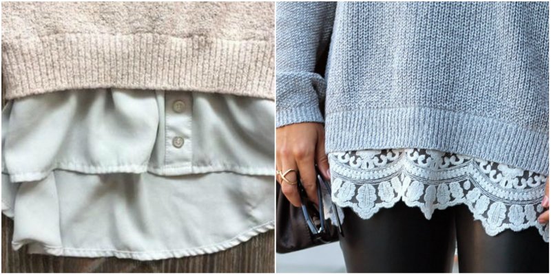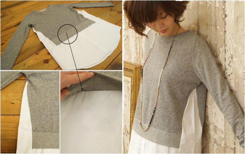 - La forma más sencilla de actualizar un suéter es coserle encima una pieza de tela fina. ¡Una excelente imitación de una blusa!