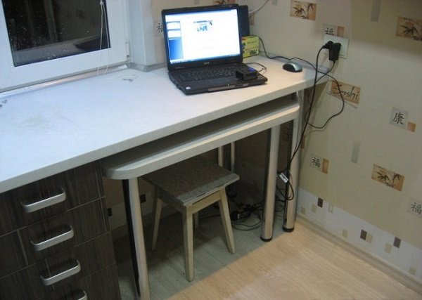 - Como puedes ver, los casilleros resultaron lo justo, pero esto es exactamente lo que le faltaba a esta pequeña cocina. Ahora, el hombre puede trabajar, leer, ver películas y tomar té junto a la ventana. Y si los amigos lo visitan, saca su mesa de debajo del alféizar de la ventana.