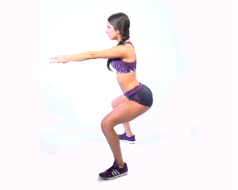 Párate con los pies más separados que el ancho de los hombros. Mantén tus manos hacia delante, para mantener el equilibrio. Siéntate, forzando así la prensa, y mantén la espalda recta. Permanece en esta posición y elévate ligeramente: levántate unos 15 centímetros y vuelve a bajar otro tanto.