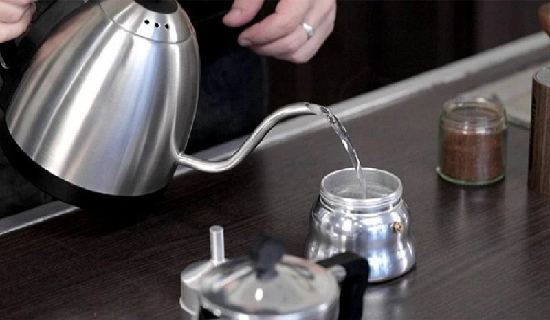 - Precalienta el agua en la tetera. Este paso es necesario por varias razones. En primer lugar, el tiempo de preparación del café se reduce significativamente, porque en el hervidor el agua hierve más rápido. En segundo lugar, la bebida puede adquirir un sabor metálico si se vierte agua fría en el moka.