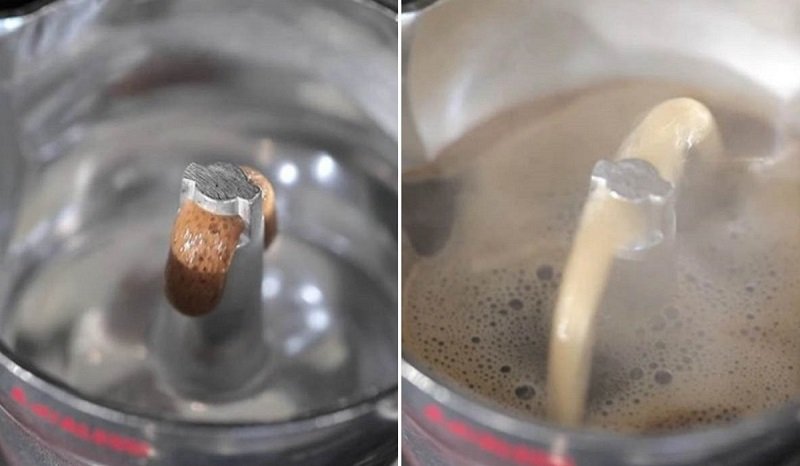 - Abre la tapa de la cafetera. Cuando veas que los chorros se han vuelto delgados y ligeros, retira el moka del fuego. Te aconsejo que coloques la base bajo agua fría para detener con precisión el proceso de extracción.
