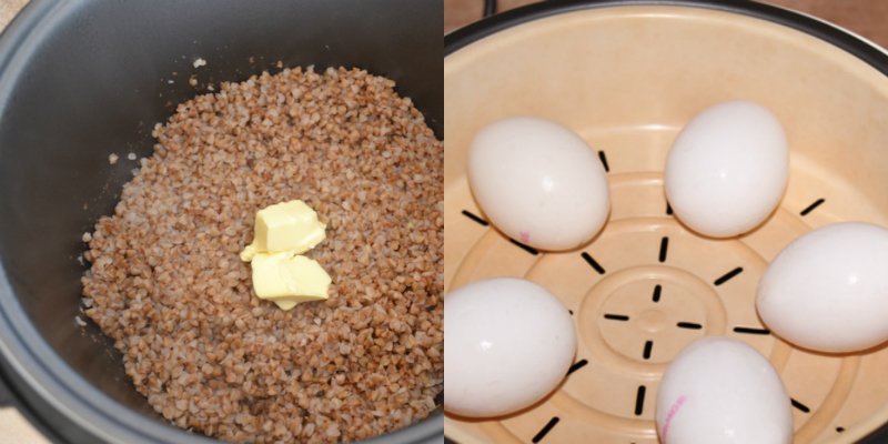 Idea de desayuno saludable: gachas de trigo sarraceno y huevos. Por la noche, vierte el cereal lavado en el recipiente multicocina, vierte agua 1: 2, agrega sal al gusto. Coloca un recipiente humeante encima y los huevos lavados con bicarbonato de sodio en él.Configure el programa de Inicio retrasado, y luego el modo Gachas y el tiempo en 25 minutos. Al levantarte de la cama te está esperando un desayuno caliente. Solo queda agregar mantequilla.