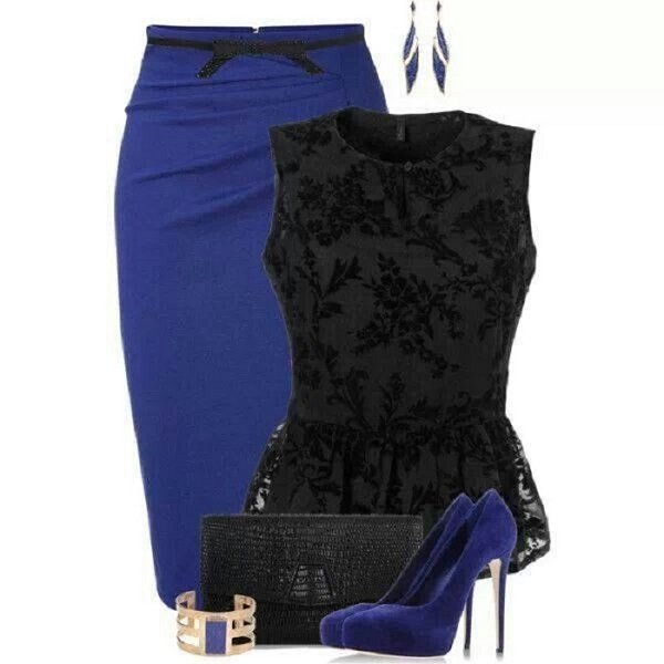- Parece que el encaje nunca pasa de moda. Una falda de lápiz azul combinado con una blusa de encaje negro y zapatos de tacón alto siempre crea una imagen única. ¡Si añades accesorios elegantes, estarás lista para las recepciones sociales más fantásticas!