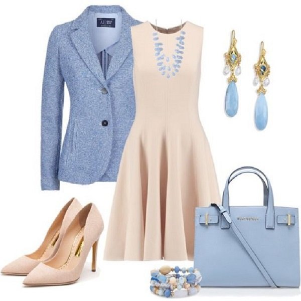- Un vestido beige de corte clásico es una auténtica bendición para tu armario. Se ve muy bien por sí solo, pero con una chaqueta clásica o capa brillante, aún más. En esta temporada, trata de combinar tu vestido favorito con cosas de color azul: una chaqueta azul, un bolso azul o zapatos azules clásicos. ¡Se ve muy tranquilo y suave!