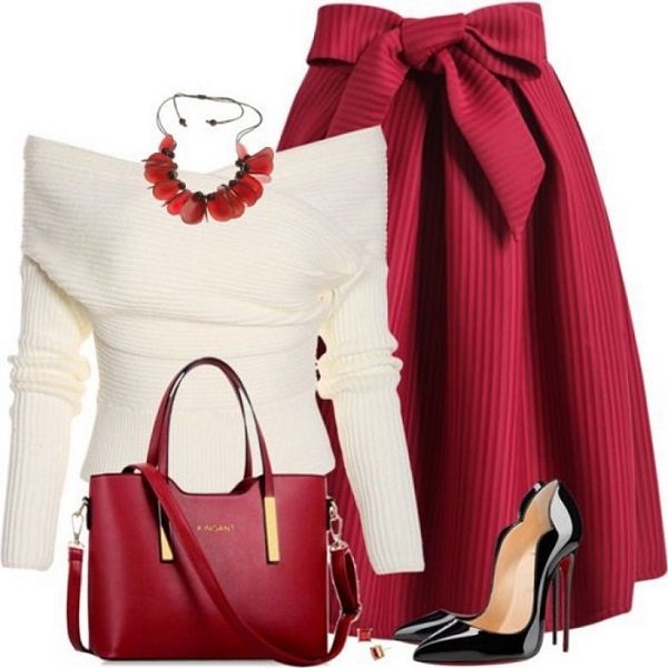 - Si puedes presumir de la presencia de una falda exuberante con estilo retro en tu armario, considera que tienes mucha suerte. ¡Pero si la falda es también de un color de vino, guau! Añádele una blusa tejida con sombras ligeras y hombros abiertos, adorna tu cuello con un collar suave, y pon en tus piernas zapatos clásicos de laca. ¡Si realmente lo que quieres es conquistar, será a primera vista!