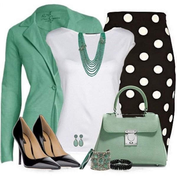 - ¡Los patrones clásicos vuelven a estar de moda! El vestido y la falda de punto de polca se combinan perfectamente con una chaqueta o un monedero color menta.