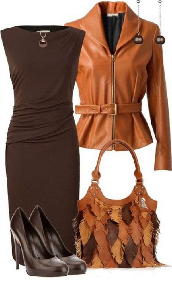 - Un vestido canela es un verdadero traje de otoño. Combina tal vestido con una chaqueta de cuero o una chaqueta de gamuza color marrón, y añade adornos y accesorios inusuales. Siéntate libre de ir con este traje a la oficina o a un paseo. ¡Con esta imagen sin igual, no perderás!