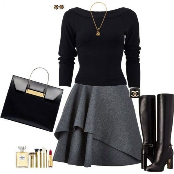 - Esta imagen femenina es elegante e inigualable. La falda gris se combina maravillosamente con los objetos de color negro. Ponte una falda gris, un suéter negro, botas negras y joyas de oro… ¡Realmente clásico!