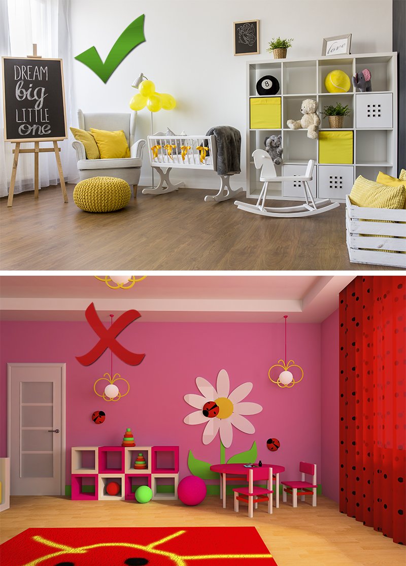 No uses todos los colores del arcoíris en el cuarto infantil. Las paredes pintadas de vivos colores revientan la mejor decoración, ¡y dañan la vista! La psique del niño estará sobrecargada de la abundancia de colores y bagatelas, y lo volverá irritable, descuidado. Arregla la habitación con colores apacibles, muebles más pequeños, estantes, carteles o dibujos en paredes… Son una opción ideal.