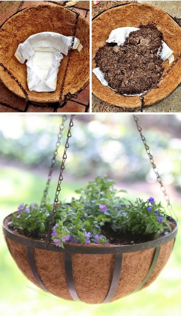 - Los pañales se pueden usar para retener la humedad dentro de la maceta.