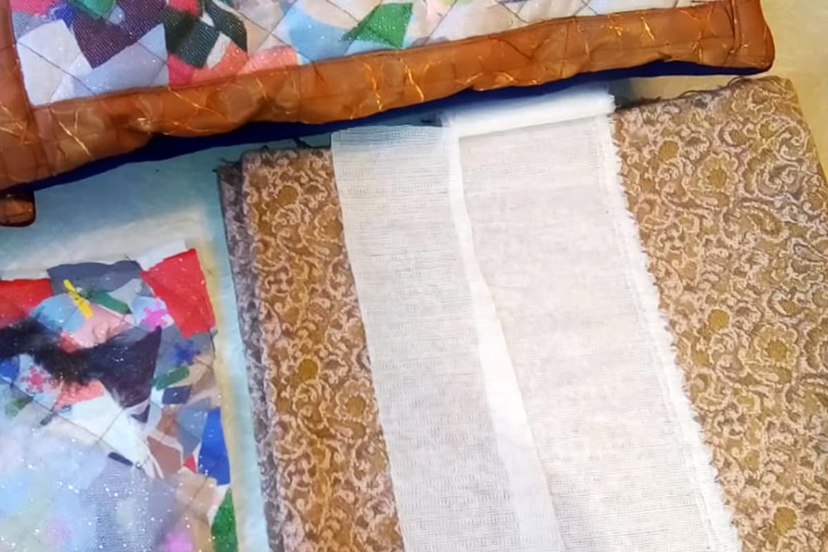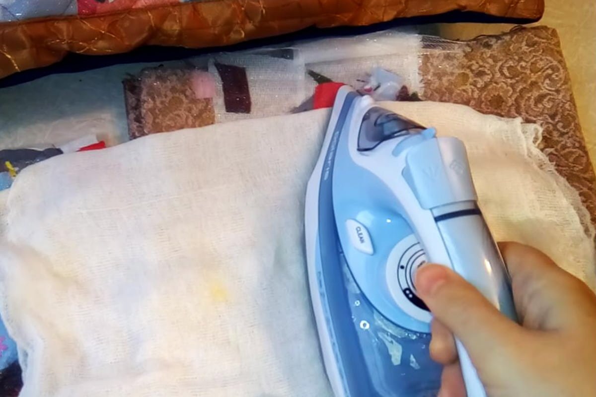- Después, toma una gasa húmeda, ponla sobre el futuro producto y presiona con cuidado con una plancha caliente, fijando todas las capas. Usando vapor, el doublerín se adhiere mejor a otros materiales. Como resultado, obtendrás una especie de «sándwich» de tela.