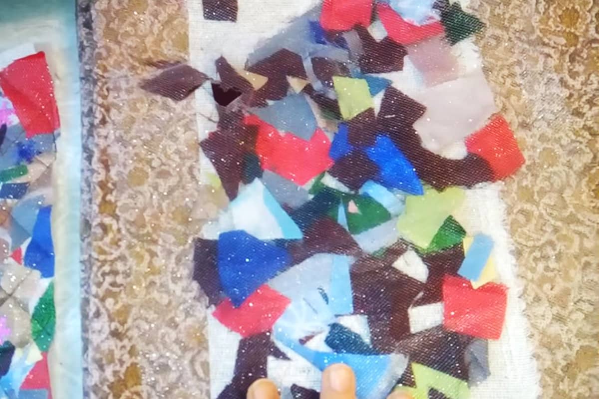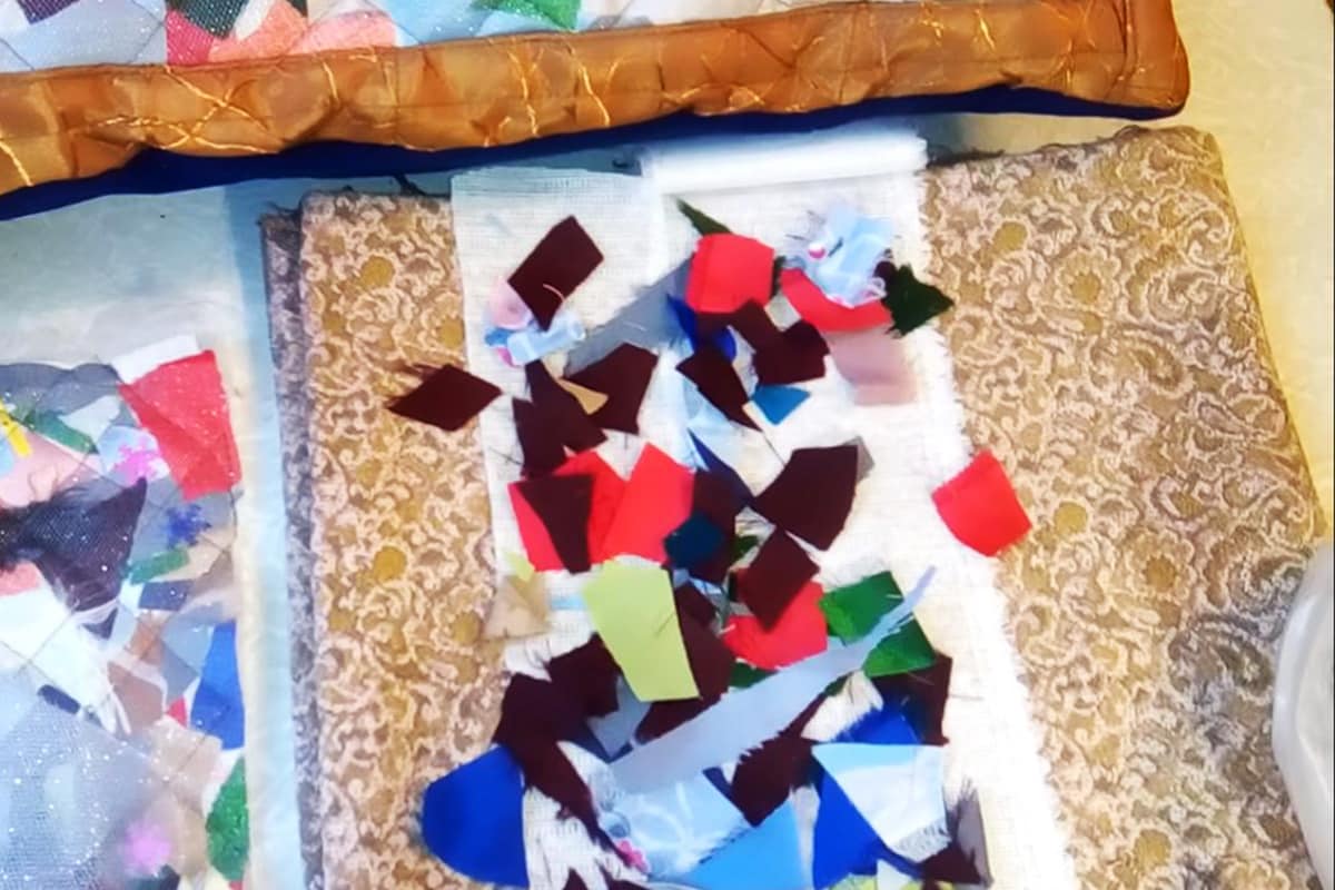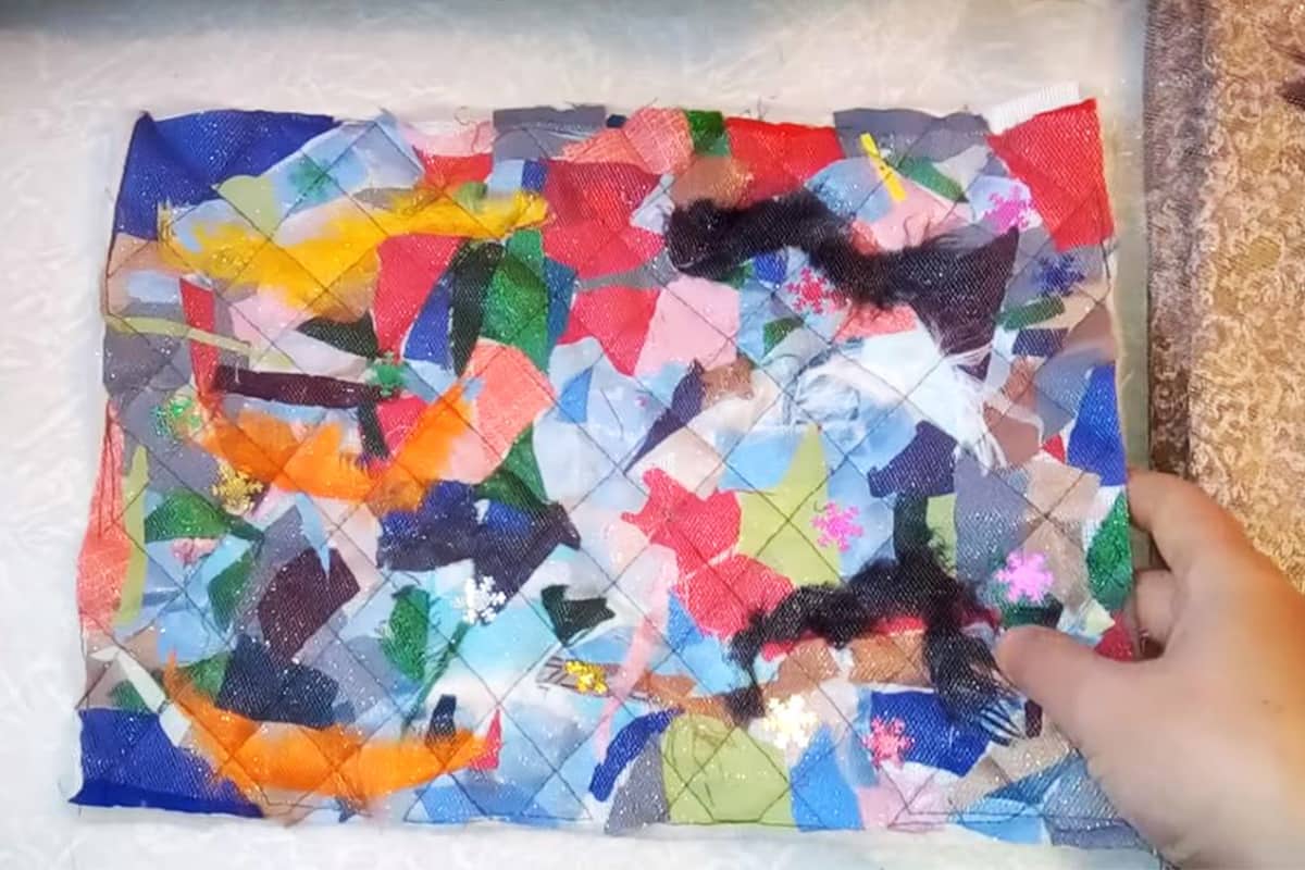 - Luego, extiende todo tipo de pequeños trozos de telas sobre el doublerín, alrededor del perímetro. En esta etapa, forma el futuro patrón del producto. Puedes seleccionar fragmentos por colores y colocarlos en una superficie adhesiva, al azar. Si lo deseas, coloca lentejuelas, plumas u otros materiales decorativos. Así, resultará más brillante e interesante.