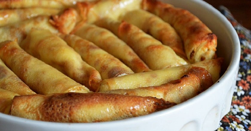 - Pon los crepes rellenos en una cazuela o una olla. Unta las capas de crepes con crema agria y mantequilla derretida.