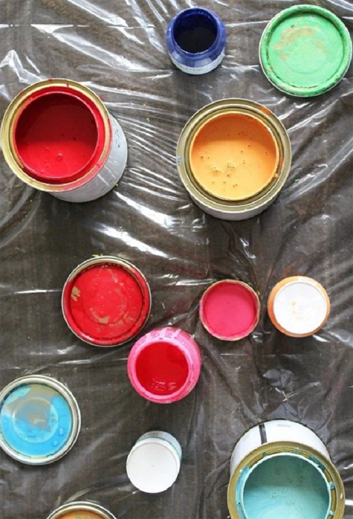 - Elige el color que necesitas y prepara los frascos de pintura. ¡Y no te olvides de cubrir el suelo con una película protectora para proteger las baldosas!