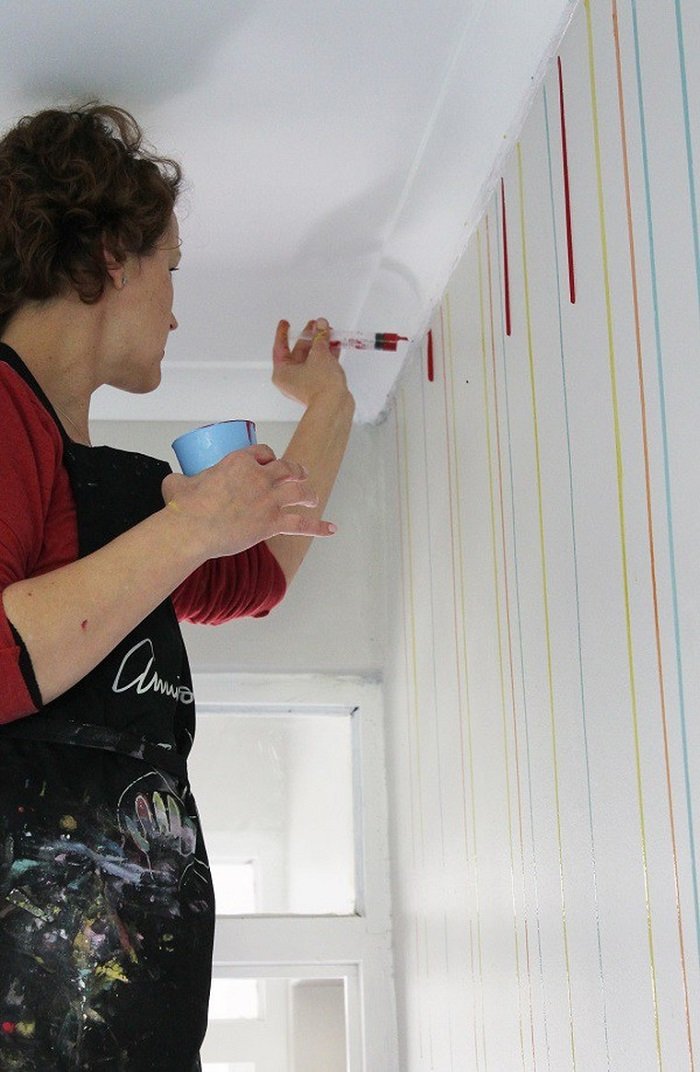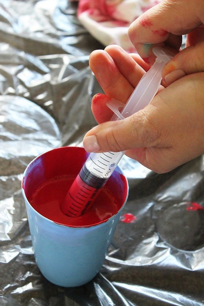 - Cuando todo esté listo y has elegido el color, toma una jeringa en la mano – rellénala con la pintura deseada y presiónala, para que gotee desde el techo hacia abajo.