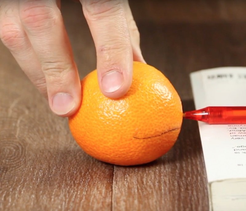 - Con el bolígrafo, marca en los frutos «el ecuador». Será más conveniente poner el bolígrafo sobre una plataforma, por ejemplo, un libro.