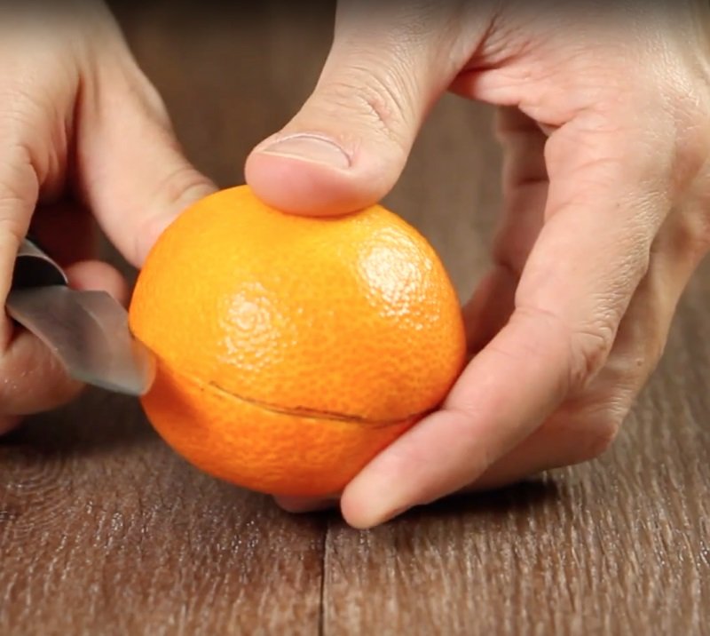 - Con un cuchillo afilado, corta la cáscara en la línea marcada. Ten cuidado de no cortar la pulpa.