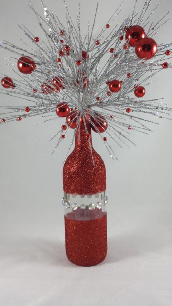 - Puedes también decorar la botella con guirnalda con una corona navideña, con brillos y otros adornos.