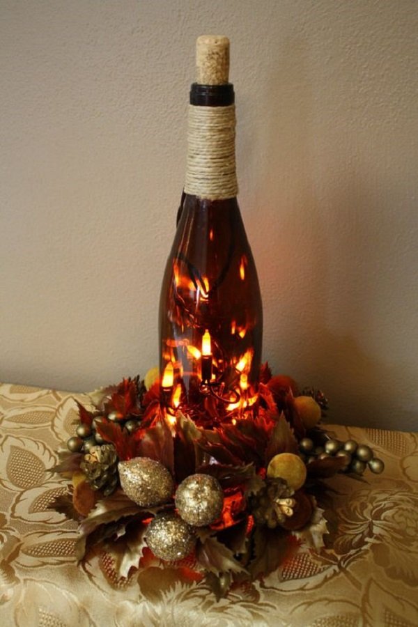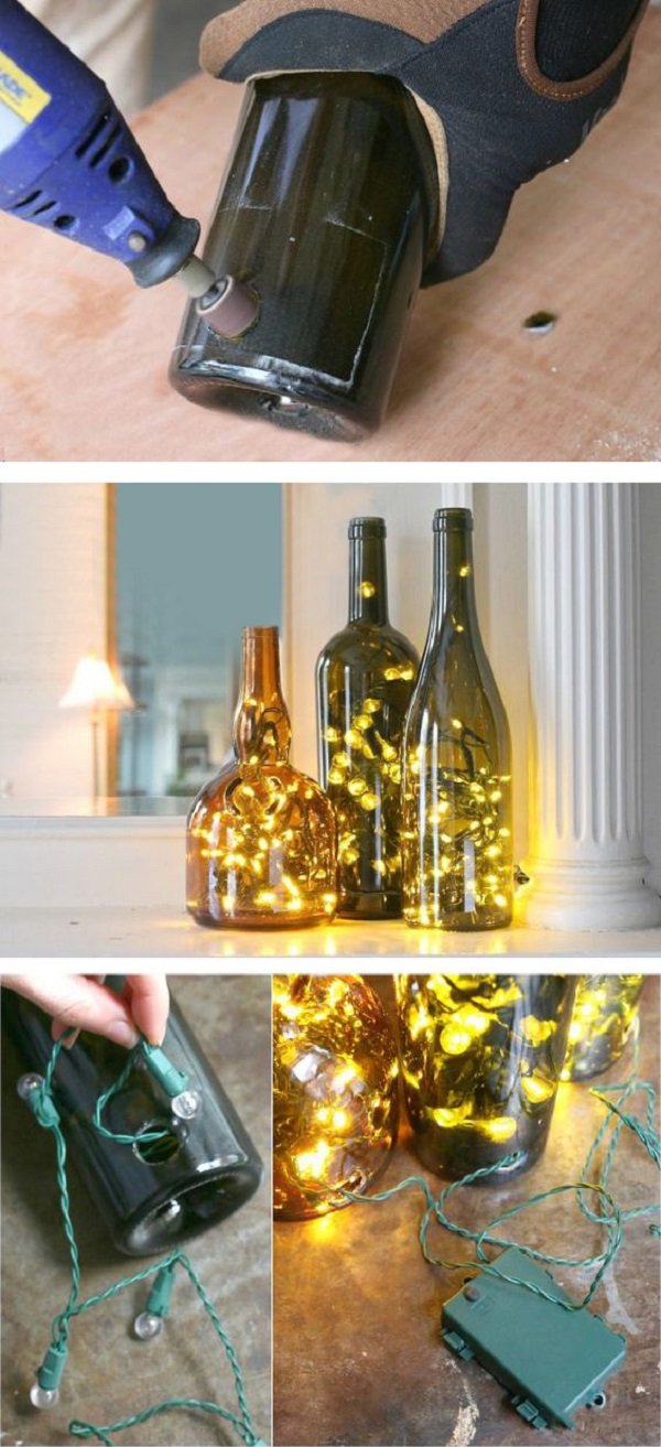 Ni te imaginas de cuántas cositas encantadoras se puede hacer para las fiestas a partir de unas simples botellas de cristal. A decir verdad, hacer cosas a mano no es de mi agrado — pues, no se me dan muy bien las artesanías… ¡Pero estas decoraciones me han inspirado muchísimo! Puedes pedir la ayuda de tus familiares, para hacer un agujero en el fondo de la botella. Luego, pasa una guirnalda a través del agujero — ¡y ya está! Ya la magia está dentro de tu casa…
