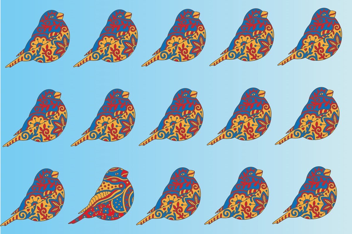 - Y aquí viene la tarea más difícil de todas. Estos pájaros de colores brillantes son muy llamativos. Pero es difícil encontrar el adecuado entre tanta variedad de colores. Todo está en los detalles, fíjate bien.
