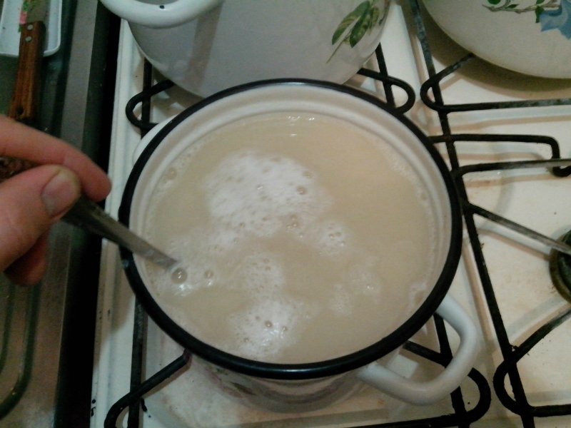 - Ralla el jabón para lavar, vierte las virutas en una cacerola, vierte agua en la misma y prende fuego al recipiente. Con agitación constante, calienta hasta lograr la completa disolución del jabón. No es necesario llevar la masa a ebullición.