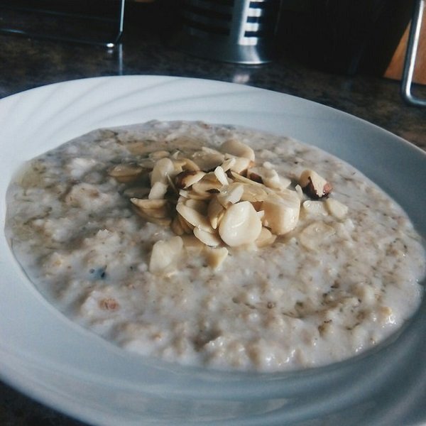- Avena con nueces sin mantequilla y leche. Es deseable, incluso sin miel. Si quieres un dulce, puedes agregar un pequeño puñado de pasas y una pizca de vainillina.