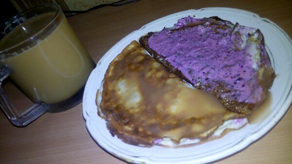 - Achicoria con leche y panqueques de avena, untados con kéfir mezclado con grosella congelada.