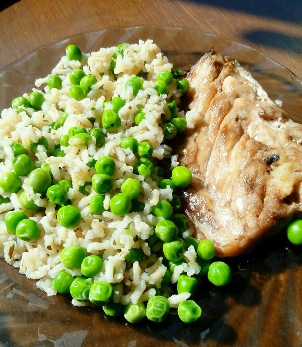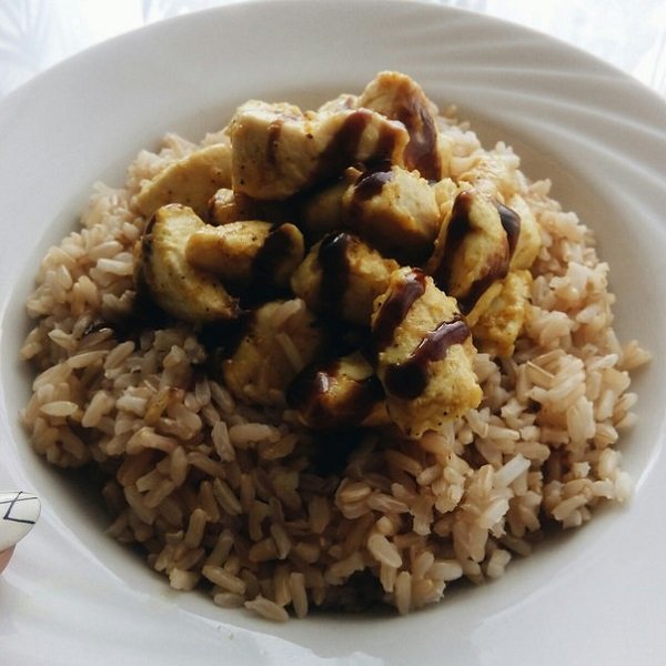 - Arroz integral con filete de pollo y salsa de soja. ¡El filete se puede apagar con especias!