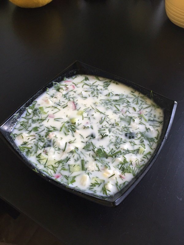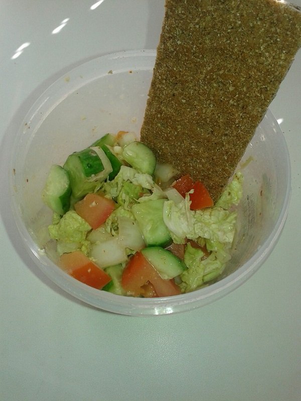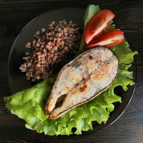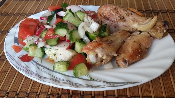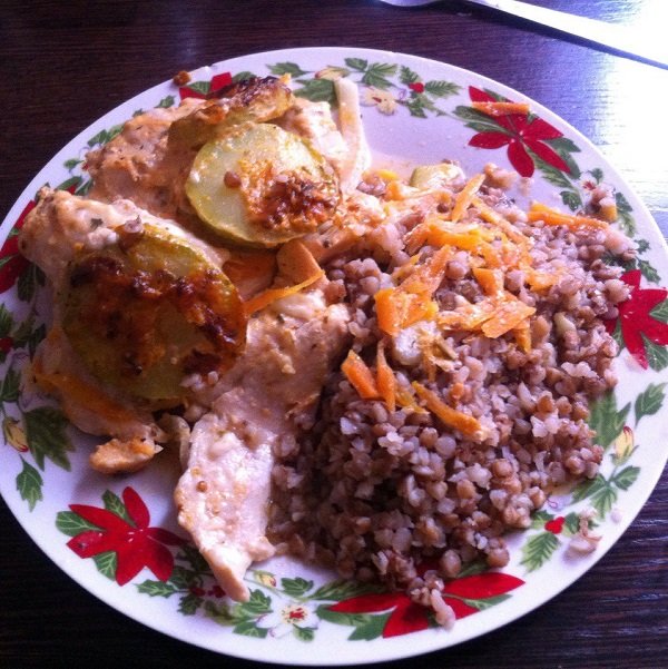 - Chuleta de pollo con gachas de alforfón y ensalada de repollo, pepinos y crema agria.