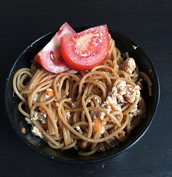 - Espagueti de trigo duro, tomates, gulash de filete de pollo, molido en una licuadora.