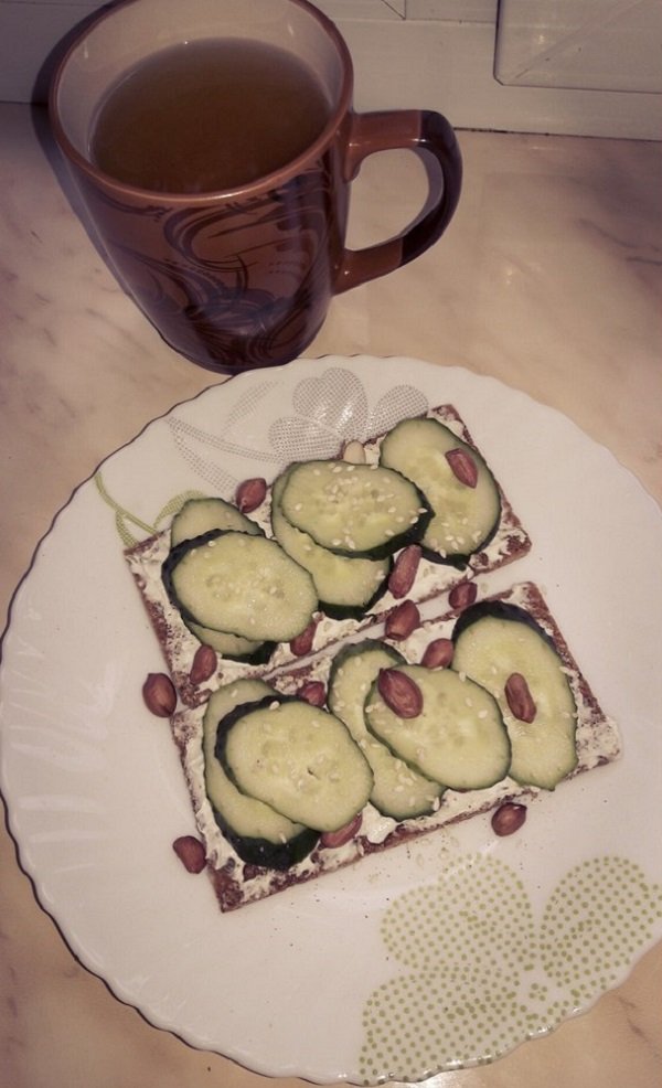 - Pan de centeno, pepinos, carne magra, queso crema o queso cottage, verduras. ¡Maravilloso sándwich para un aperitivo!