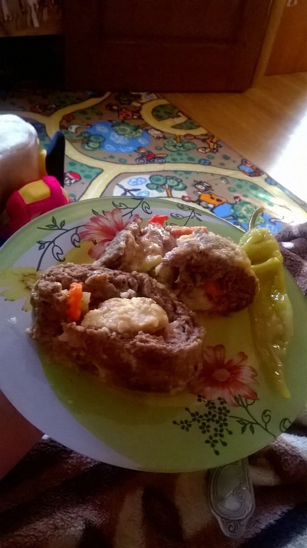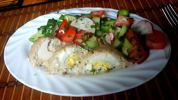 - Rollo de carne de pollo, relleno de verduras y una pequeña cantidad de queso.
