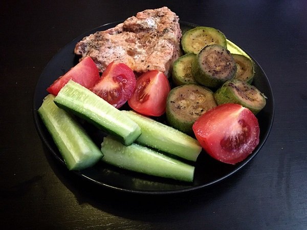 - Pechuga de pollo picado con calabacín y huevo, ensalada de verduras.