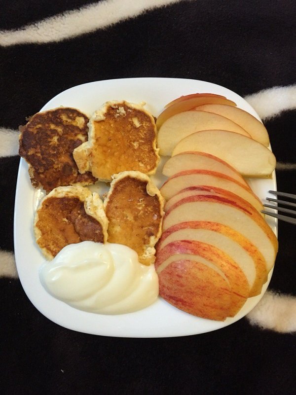- Tartas de queso, hechas con un poco de crema agria baja en grasa, una manzana.