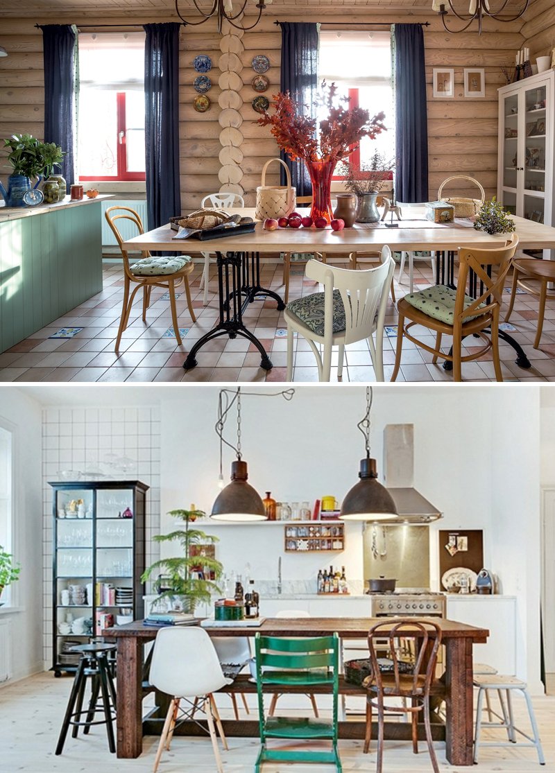 ¡Abajo el aburrimiento en la cocina! Usa sillas multicolores o cardinalmente diferentes en la decoración. Lo principal es que debn tener un tamaño similar.