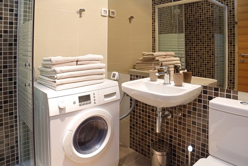 - La ventaja del baño es que puedes cargar la ropa sucia, incluso hasta la que llevas encima, y el funcionamiento de la máquina es prácticamente inaudible en comparación con la cocina. Desventaja: espacio reducido, la complejidad de la carga y descarga, y por supuesto, el problema de la ventilación.