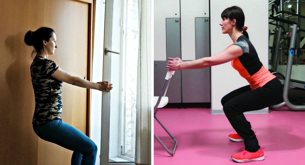 Encuentra un soporte fijo. El respaldo de una silla o una puerta pueden servir. De cara al soporte, agarra las manillas o el respaldo y coloca los pies separados a la anchura de los hombros, mirando hacia delante. Agáchate lentamente al exhalar y levántate lentamente al inhalar. Intenta tensar los músculos de los glúteos.