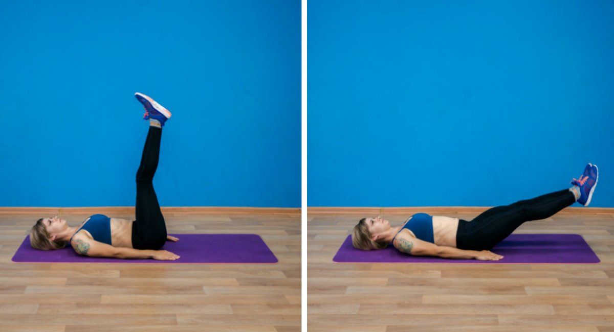 Túmbate de espaldas en el suelo, estira los brazos a lo largo del torso y presiona la parte baja de la espalda contra el suelo. Levanta las piernas rectas en un ángulo de 90 grados y luego bájalas lentamente. No te olvides de respirar. Si sientes una fuerte flexión en la parte baja de la espalda, pon los pulgares debajo de la pelvis. Haz de 5 a 10 repeticiones en cada enfoque.