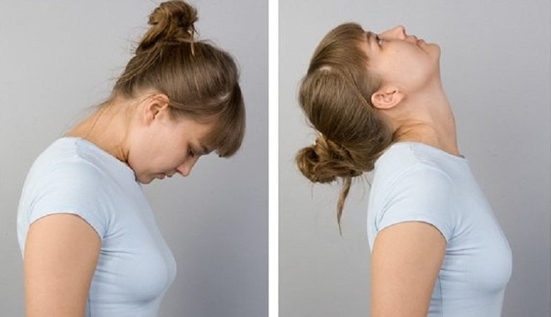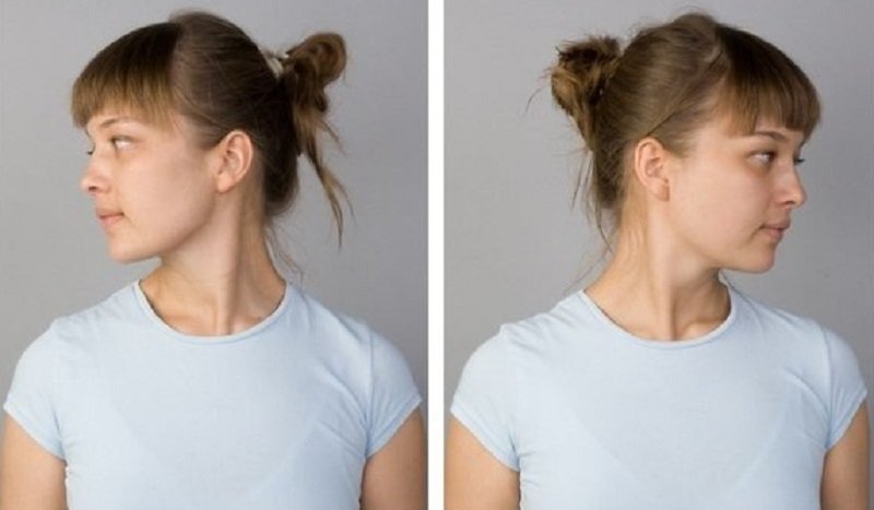 Sentado en la silla con las manos a lo largo del cuerpo, inclina la cabeza hacia abajo. Trata de llegar con la barbilla hasta la cavidad torácica. Has por lo menos 10 repeticiones de este ejercicio.