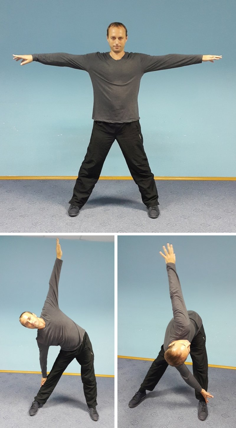 Las pendientes tienen un poderoso poder curativo. Fortalece la espalda baja, estira los tendones. Se realiza de pie, con los pies al doble de la anchura de los hombros y los brazos a los lados. Sin cambiar la posición de las manos, inclínate hacia el lado derecho. Realiza un par de ciclos de respiración (inhala-exhala) y toca el tobillo de tu pierna izquierda. Vuelve a la posición inicial. Repite para el lado opuesto, 5-6 veces cada uno. Al final del ejercicio, haz una flexión hacia atrás compensatoria.