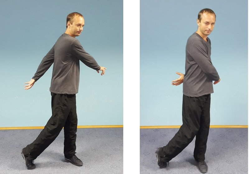 Este ejercicio relaja la espalda y la cintura escapular. Pies separados al ancho de los hombros, brazos relajados. Haz «látigos» con las manos, simultáneamente con giros alrededor de la cintura. Aumenta la intensidad con cada golpe.