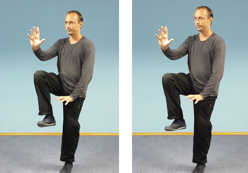 En qigong, este ejercicio se llama «el gallo de oro se para en una pierna». Es mejor quitarse los zapatos. La coordinación, el equilibrio, la destreza se desarrollan bien. La medicina oriental cree que el ejercicio cura las raíces de las enfermedades y fortalece la inmunidad del cuerpo.