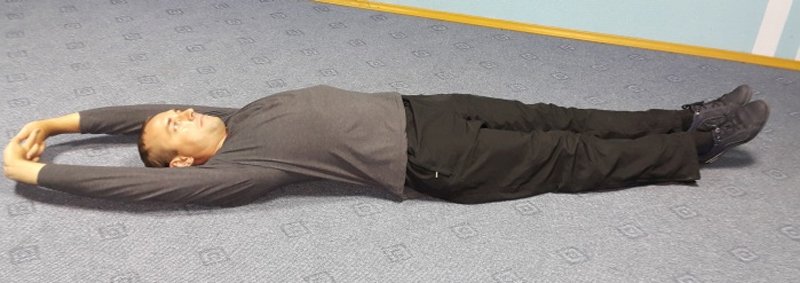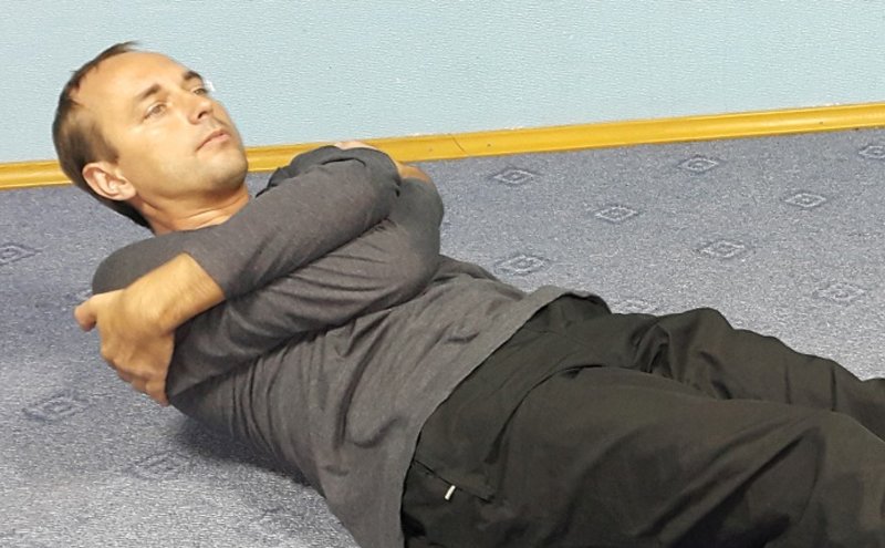 Este ejercicio trabaja la parte superior de la espalda, especialmente la parte entre los omoplatos. Es mejor realizarlo inmediatamente después del «rodillo» o en combinación con él. Acuéstate boca arriba, envuelve tus brazos alrededor de sus hombros. Levanta y redondea. «Toca» tu espalda en la superficie, cambiando alternativamente las manos sobre tus hombros. Haz 12 repeticiones, 6 para cada brazo.